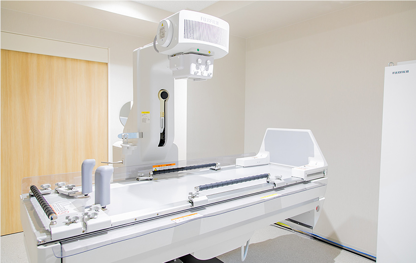 乳房を圧迫板で挟んだ状態でX線撮影を行う検査です。どの方向からでも乳房の病変が確認できるよう、左右それぞれの乳房を斜め縦方向と上下方向から撮影します。撮影は女性技師のみが行います。